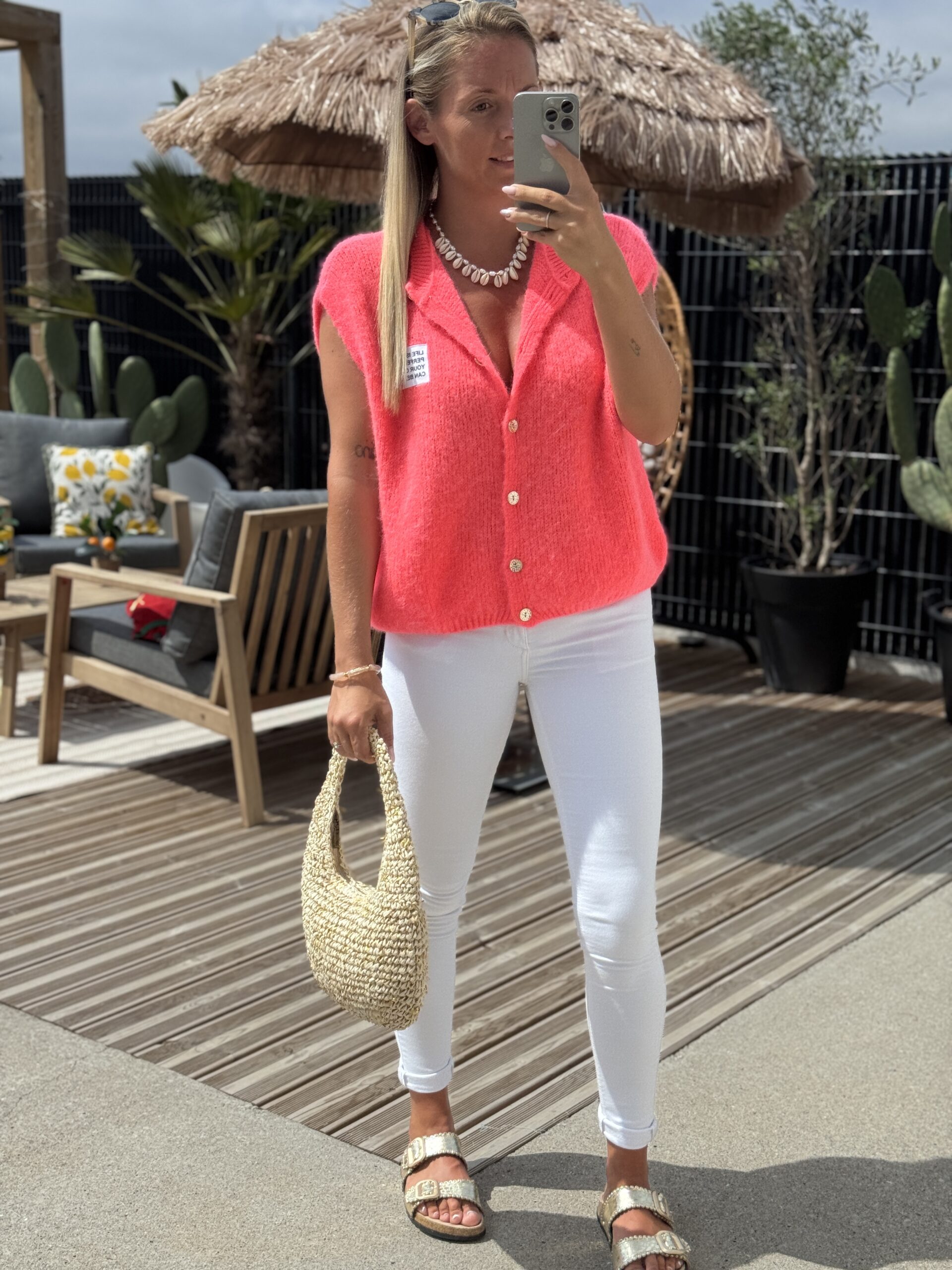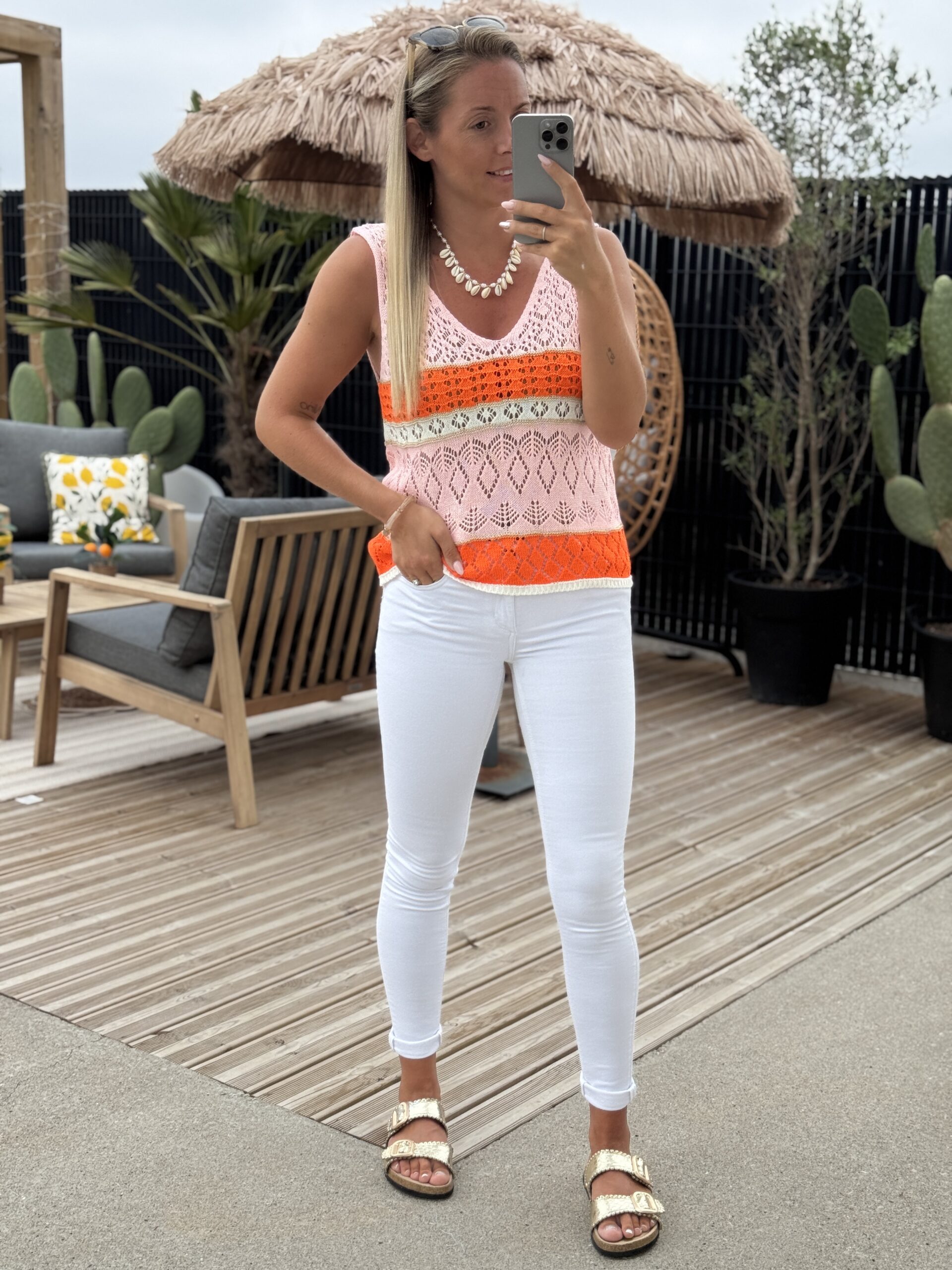 Accessoires portés par le mannequin : Boucles d’oreilles 206, Blouse DOSSA, Sac BENODET Or, Basket VALENCIA